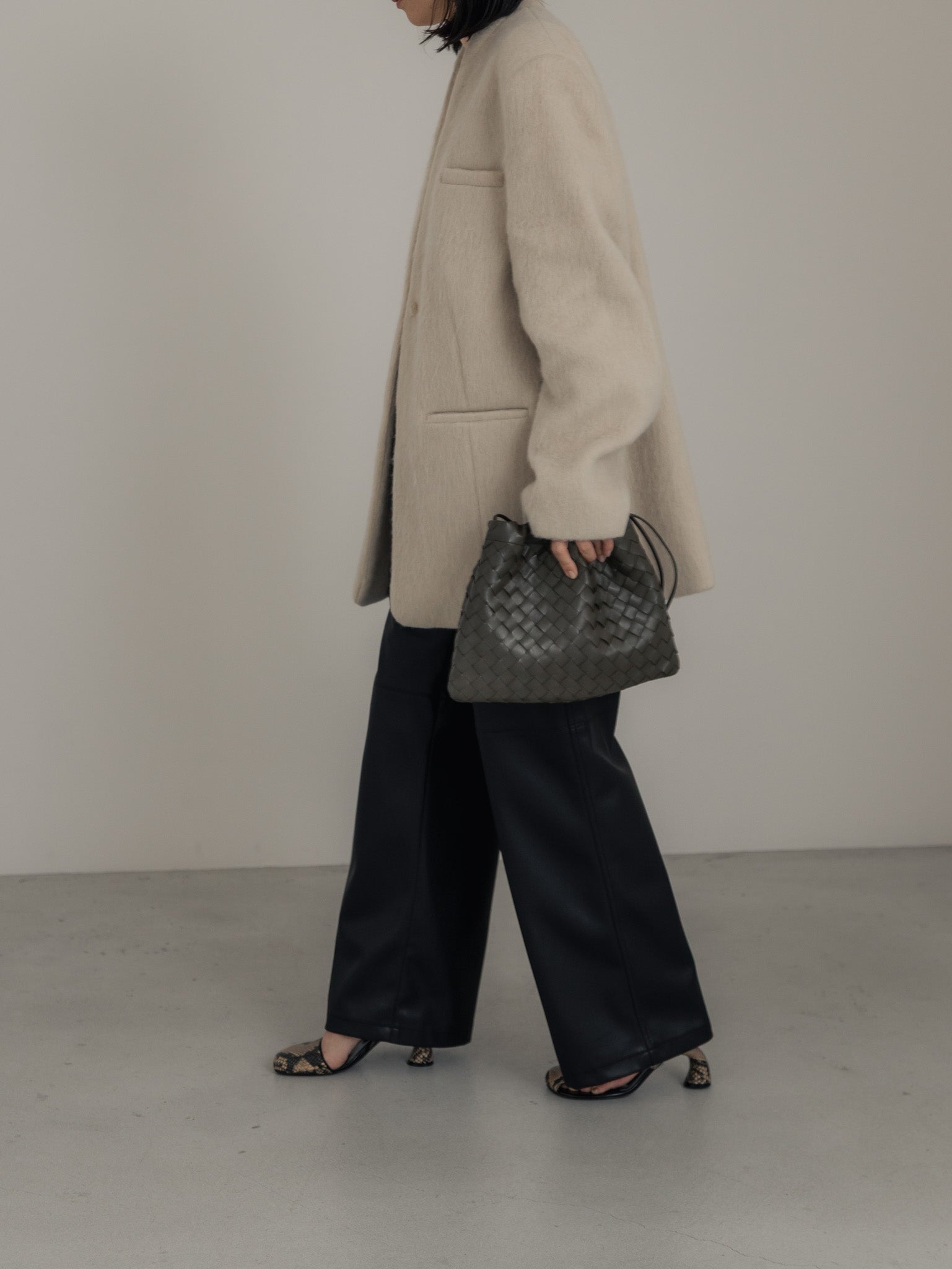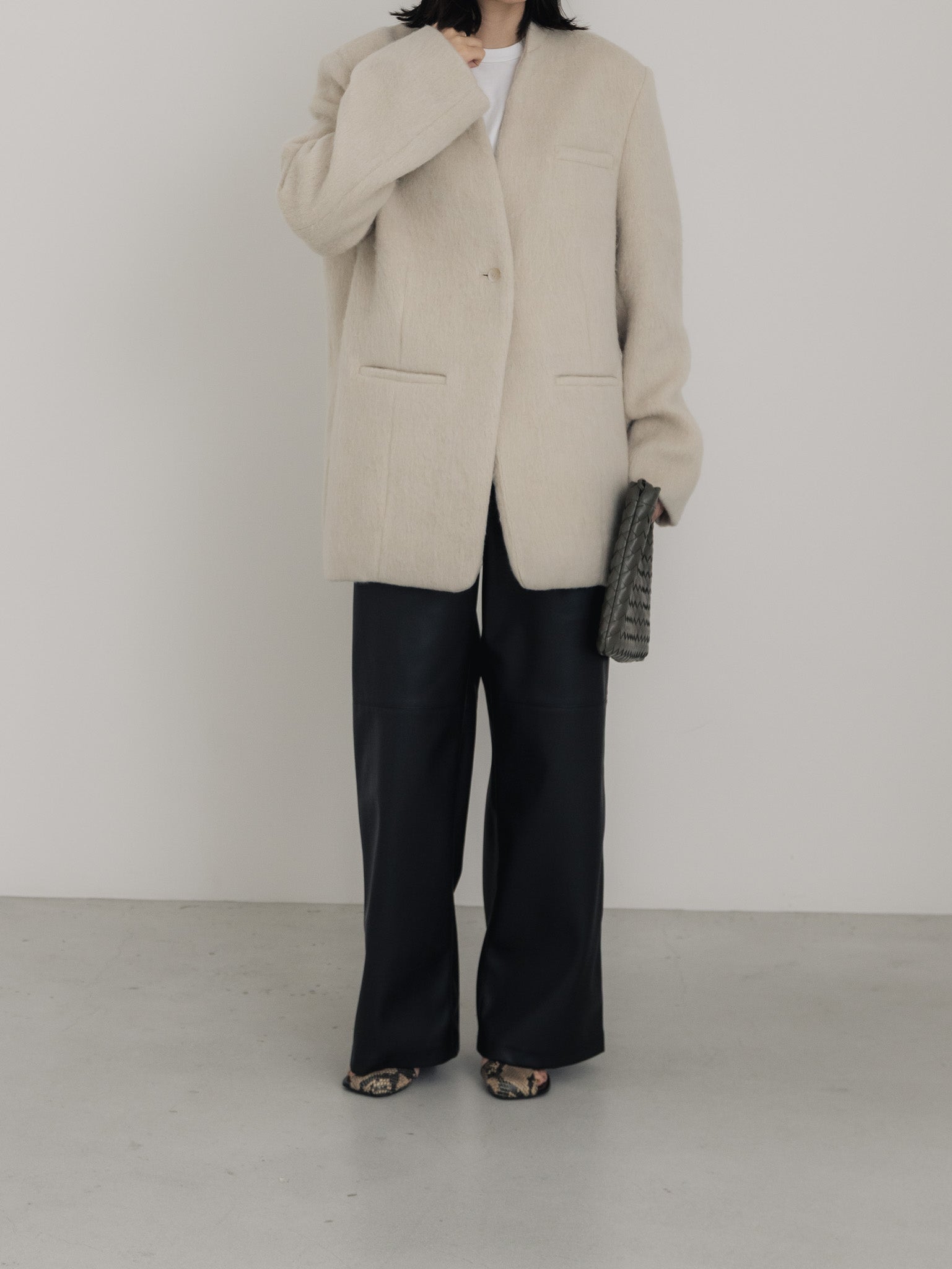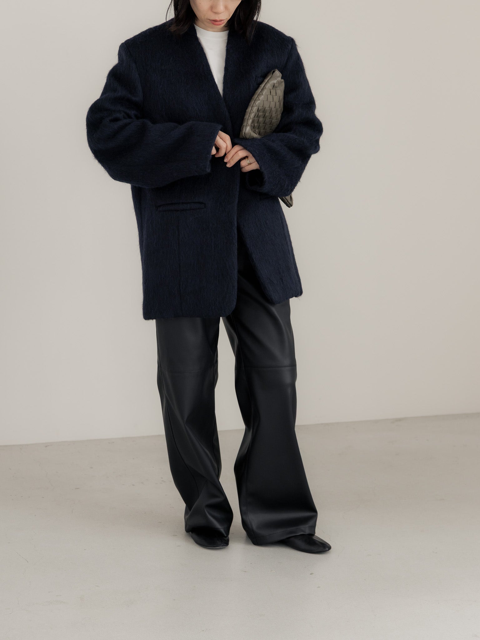 上品な艶とマットな質感のバランスが程よいので表面が美しく、ストレッチが効いており、柔らかさと膨らみのあるフェイクレザーを使用。