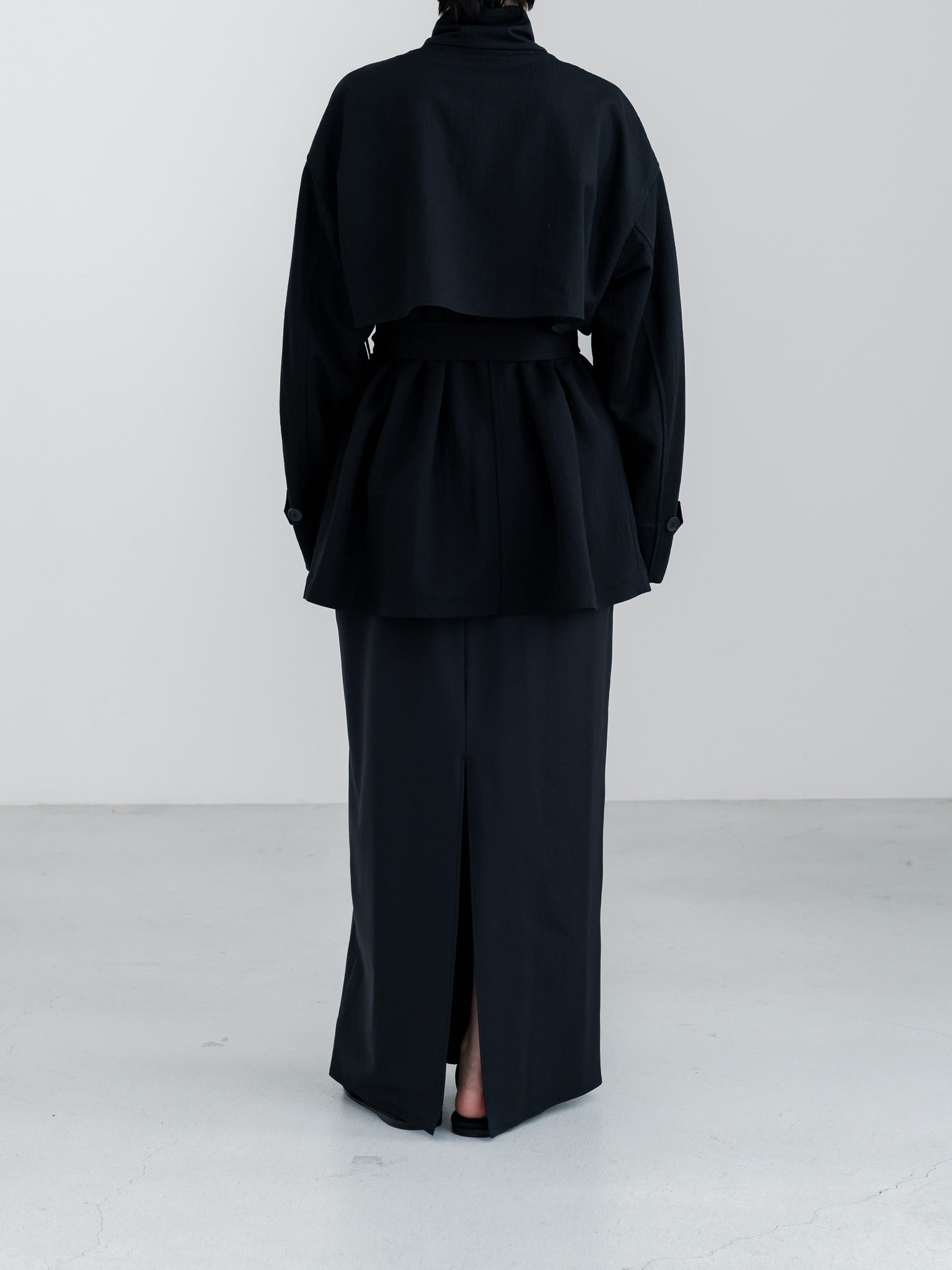 かっこよい雰囲気のあるサファリジャケットを、とろみ、ドライ感、繊細さを感じる女性らしい素材で作ることにより生まれた、良い塩梅で混じり合うテイストの融合感を楽しんでいただけます。