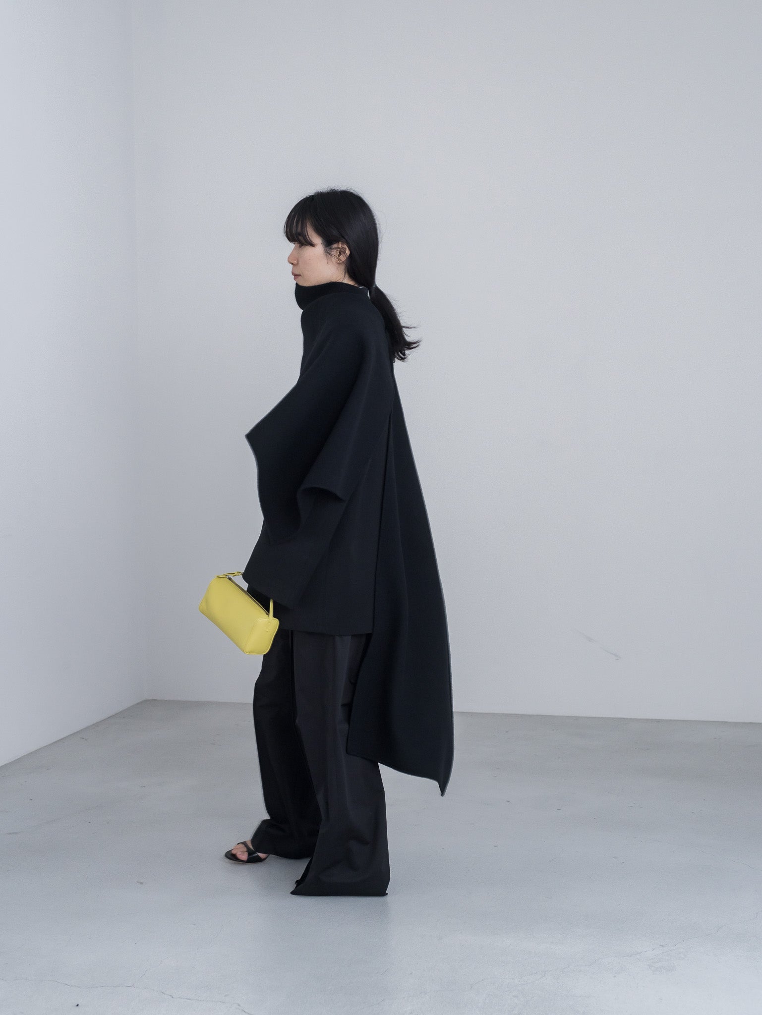 位置のずれたスナップ釦が2箇所あり、長さをアシメにしたり、左右対称にしたりとその時の気分や雰囲気に合わせて調節可能
